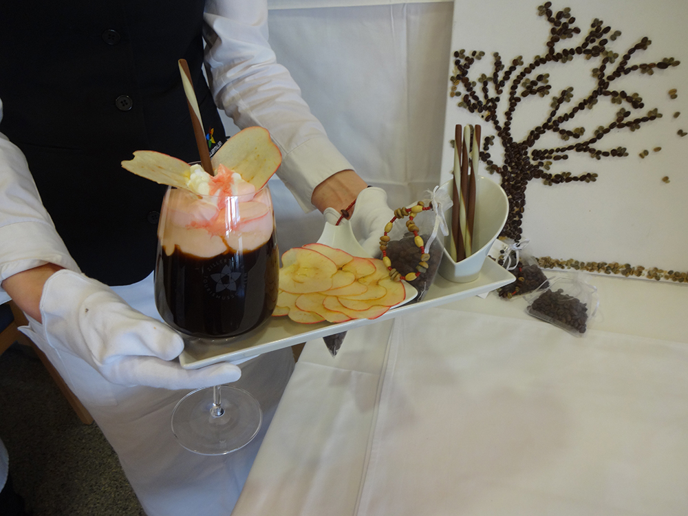 In der ersten Klasse der Höheren Lehranstalt für Tourismus hatten wir eine spezielle Kaffeeausbildung, bei der unsere Neugierde von der ersten Stunde an geweckt wurde. Das führte sogar dazu, dass wir uns auf jede weitere Stunde freuten. Deshalb war es für uns ganz klar, dass unser Cocktail/Longdrink die Komponente Kaffee enthalten soll. Natürlich werden die rohen Bohnen an der Schule von uns geröstet. Wir haben vier verschiedene Bohnensorten geblendet und mit der sogenannten cold brow Methode die Inhaltstoffe 24 Stunden ausgelaugt. Unser Drink besteht aus 125 ml Kaffee, zwei cl Karamellsirup Monin, Heurahmespuma und wird mit 1,5 cl Spicy Monin verfeinert. Garnitur von getrockneten Scheiben vom Zillertaler Klarapfel und Schokostrohhalm von der Tiroler Edlen machen unsere Kreation zu einem Sommergetränk, bzw. After dinner Cocktail. Unser Drink wird im Boston Shaker zubereitet.
